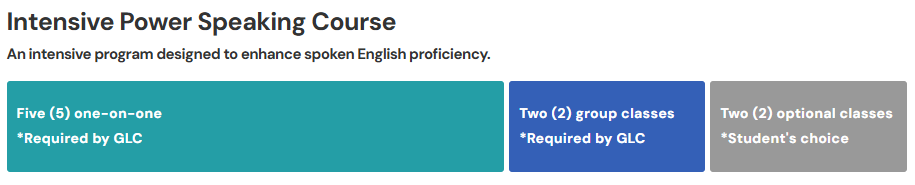 - Intensive Power Speaking คลาสเรียนแบบตัวต่อตัว 5 ชั่วโมง และคลาสเรียนแบบกลุ่ม 2 ชั่วโมง